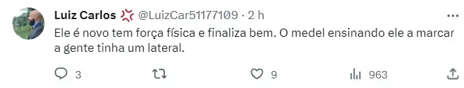 “Ele é novo tem força física e finaliza bem. O Medel ensinando ele a marcar a gente tinha um lateral”