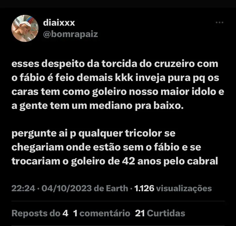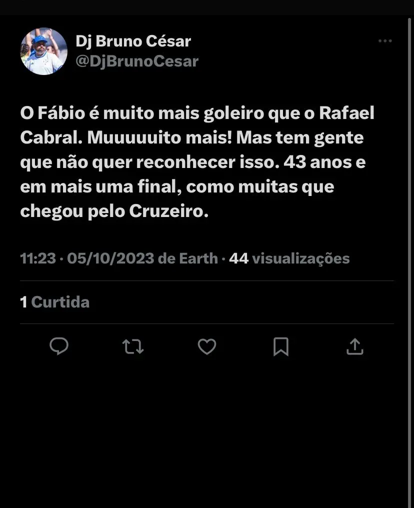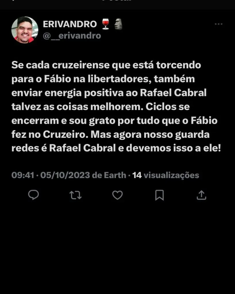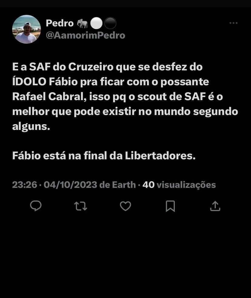 A maioria lamenta a escolha de Ronaldo por não ter mantido o vínculo com o arqueiro e criticam Rafael Cabral, atual goleiro do time pelas falhas recentes: (SIC) “Fábio, teve uma linda passagem no Cruzeiro. Não é o maior goleiro do clube, mas está na lista dos maiores jogadores da sua história centenária. Cabral, veio em um momento delicado fez a sua parte em 22 porém não é goleiro pra grandeza do Cruzeiro”; “Se cada cruzeirense que está torcendo para o Fábio na libertadores, também enviar energia positiva ao Rafael Cabral talvez as coisas melhorem. Os ciclos se encerram e sou grato por tudo que o Fábio fez no Cruzeiro. Mas agora nosso guarda redes é Rafael Cabral e devemos isso a ele”, disse outro torcedor do Cabuloso sobre a situação.
