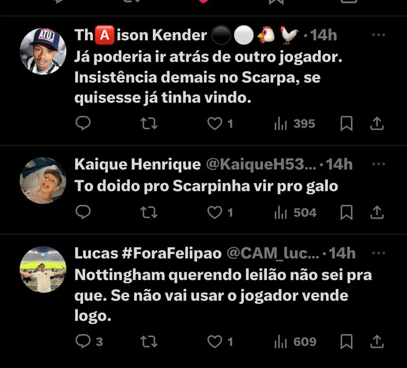 Diante disso, após essa reviravolta, a torcida do Galo se dividiu sobre a insistência no meia: (SIC) “Já poderia ir atrás de outro jogador. Insistência demais no Scarpa, se quisesse já tinha vindo”; “Nottingham querendo leilão não sei para que. Se não vai usar o jogador vende logo”, foram alguns comentários.