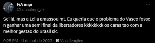 Por outro lado, torcedores vascaínos enxergaram a possibilidade de uma colaboração futura entre Leila Pereira e o Vasco de maneira positiva. Muitos comentários sugeriram que a presidente e a Crefisa, da qual é proprietária, poderiam contribuir com o clube carioca, “Venha tia Leila e Crefisa. Larga esses ingratos aí” e também, “Traga a Leila para o Vasco, imediatamente”.
