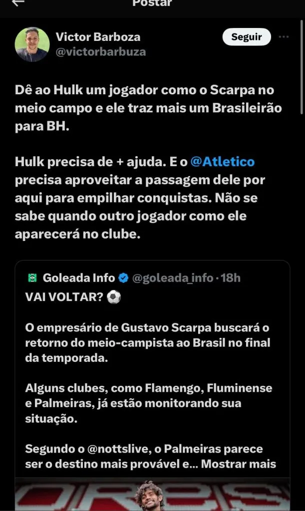 Porém, apesar disso, na visão de alguns, para o camisa 7 ganhar mais títulos em BH, a diretoria teria que trazer um meia com qualidade e ele tem nome e sobrenome: Gustavo Scarpa. O ex-Palmeiras está no futebol do exterior, mas essa semana um site inglês afirmou que ele tinha chances de retornar ao Brasil e a torcida do Galo comentou: (SIC) “Dê ao Hulk um jogador como o Scarpa no meio campo e ele traz mais um Brasileirão para BH. Hulk precisa de MAIS ajuda. E o Atlético precisa aproveitar a passagem dele por aqui para empilhar conquistas. Não se sabe quando outro jogador como ele aparecerá no clube”; “Ele e o Paulinho vão deitar e rolar com um meia deste nível técnico, gostaria muito de ver o Pedrinho com liberdade jogando do lado direito”, foram os comentários da torcida.