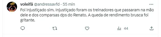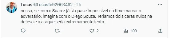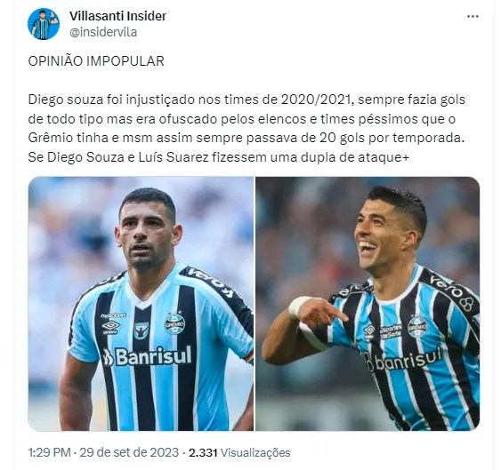 No entanto, alguns gremistas divergiram da opinião do torcedor. Um deles criticou até Suárez: “Nossa, se com o Suárez já tá quase impossível do time marcar o adversário, imagina com o Diego Souza. Teríamos dois caras nulos na defesa e o ataque seria extremamente lento”, divertiu um usuário. Outro, acabou indo na mesma linha: “Diego Showza e Luisito Suárez não foram dupla pelo bem do futebol brasileiro”, disse.