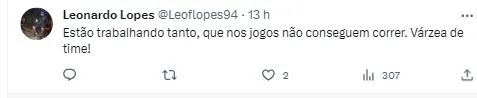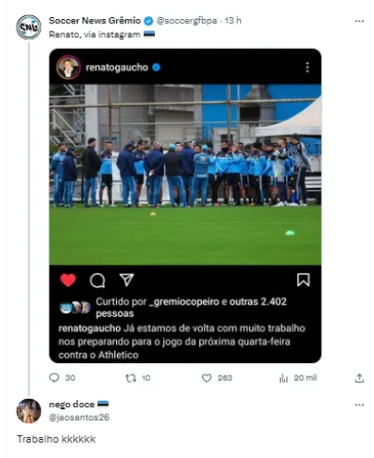 Muitos ironizaram a publicação do comandante dizendo que “muito trabalho” ainda não está sendo visto em campo. Isso porque muitos torcedores questionaram o desempenho da equipe em campo nos últimos jogos (a equipe vem de uma derrota para o Internacional e um empate diante do Fortaleza, ambas partidas fora de casa).
