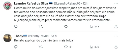 Já nas redes sociais a torcida ainda sente o ocorrido, ainda mais que aconteceu em uma partida importante como um clássico. O treinador publicou em seu Instagram uma foto com o elenco com a legenda “Já estamos de volta com muito trabalho nos preparando par ao jogo da próxima quarta-feira contra o Athletico”. Após o post, torcedores não perdoaram Renato e criticaram a postura do treinador.