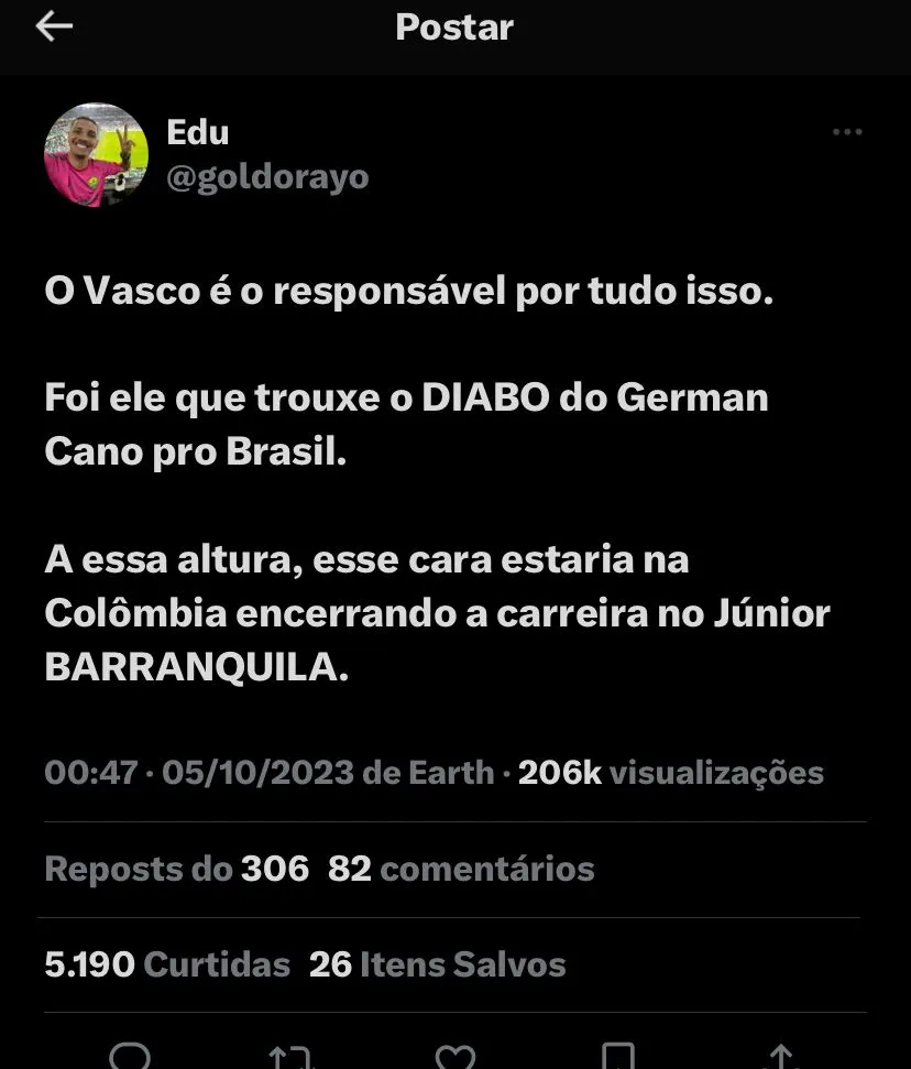 Cano saiu do Vasco e teve propostas de diversos times, mas acabou indo para o Fluminense, onde poderá ganhar a Libertadores e é um dos principais jogadores do time na competição. Nas redes sociais, os torcedores do Gigante reagiram a essa possibilidade (SIC): “A incompetência financeira do Vasco jogou o Germán Cano no colo do Fluminense. Adivinha em qual gestão isso aconteceu? Na gestão do senhor que estava se gabando de 500 feitos positivos ao Clube pra Globo”; “Se o Cano der esse título pros caras, eu passo a considerá-lo a pior contratação da história do Vasco com passos largos de distância para a segunda colocação! Perdeu o pênalti que rebaixou, perdeu o pênalti que não subiu… Eu preferiria ter passado 3 anos com o Ribamar, filho”, foram os comentários vascaínos.