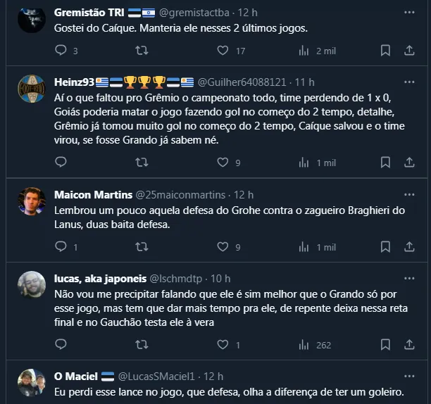 Assim, após realizar uma lindíssima defesa durante o jogo, o assunto repercutiu entre os gremistas e sobrou para o antigo titular. Isto é, os gremistas não só criticaram Grando, como pediram sequência para Caíque.