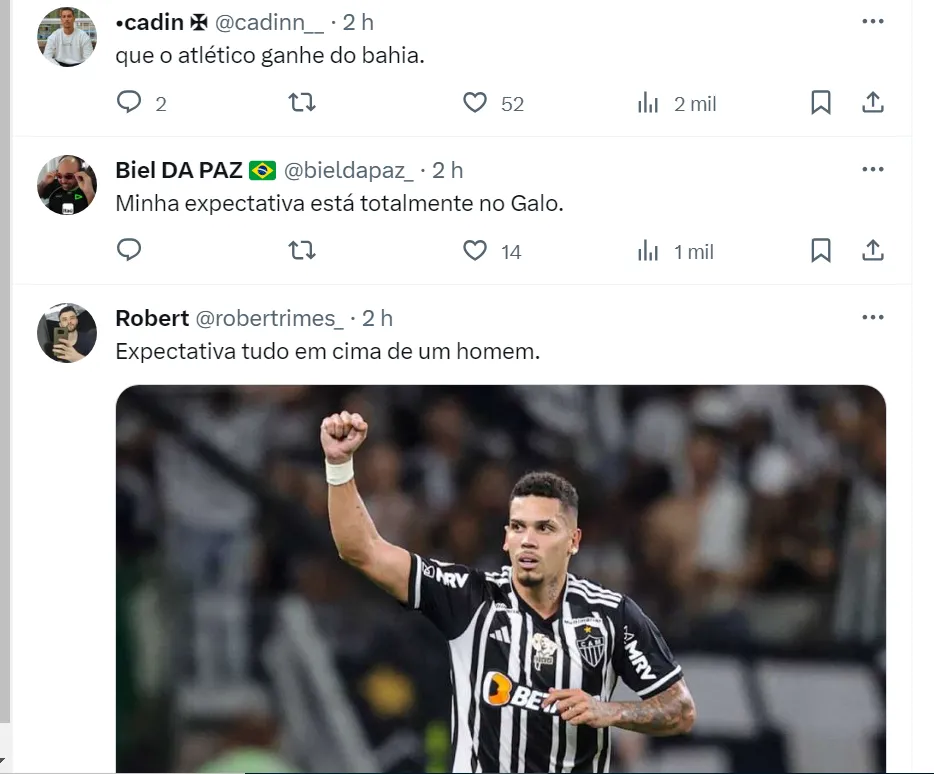 No Twitter, o perfil ‘News Colina’ perguntou a expectativa para quarta-feira (3) e a maioria das respostas que a confiança está em uma vitória do Galo. O time mineiro faz um grande segundo turno e aparece na segunda colocação.