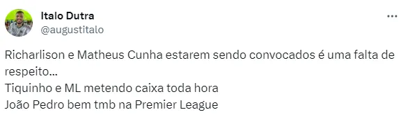 Em meio às brincadeiras e pedidos pela convocação do camisa nove do Botafogo, a cobrança sobrou para os atacantes convocados. Principais alvos de críticas, Richarlison e Matheus Cunha foram os jogadores mais apontados. Entre as falas de torcedores, suas convocações foram consideradas como “falta de respeito”, em referência ao momento de baixa vivido pelos atletas, que foram selecionados no lugar de jogadores em alta, como Tiquinho Soares e Marcos Leonardo, do Santos.