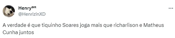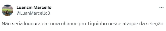 O Botafogo vive sua melhor fase em anos, e a torcida não perde oportunidades de destacar o bom momento. Desta vez, os apaixonados pelo Glorioso não perdoaram o empate da Seleção Brasileira contra a Venezuela para citar um de seus principais jogadores da temporada: Tiquinho Soares. Apesar de ser artilheiro do Campeonato Brasileiro, o atacante não esteve presente nas convocações do treinador Fernando Diniz.