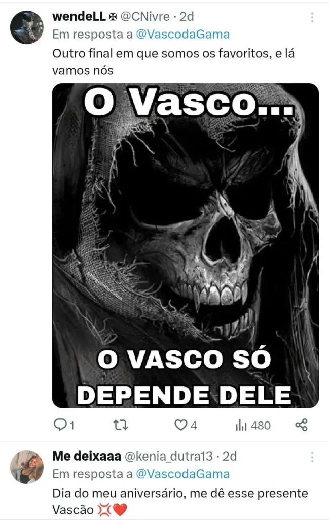 “Se ganharem quarta, próximo ano seremos campeões da copa do brasil, só pensar dessa forma.”, projetou um internauta. “Vamos pra cima! Se jogar com vontade e inteligência, vencemos. A pressão está neles”, impulsionou outro.