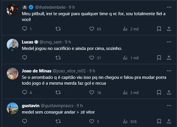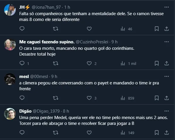 Por mais que tenha vacilado no lance do primeiro gol corinthiano, Medel jogou no sacrifício e foi um dos melhores nomes do Vasco em campo. Até por isso, recebeu inúmeros elogios da torcida após o apito final.