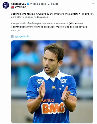 Recentemente, surgiram especulações sobre um possível interesse do Cruzeiro em repatriar Everton Ribeiro, que está em fim de contrato no Flamengo. A volta do craque seria um excelente primeiro passo para que a SAF celeste recupere a confiança da torcida celeste e aponte uma mudança de mentalidade para o ano que vem.
