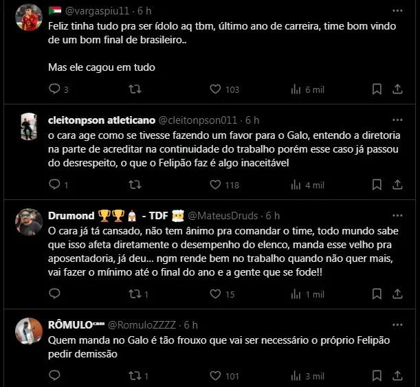 Nas redes sociais, os torcedores do Atlético-MG fazem campanha pela saída de Luiz Felipe Scolari e o treinador não precisa passar por essa pressão toda. As partes poderiam chegar a um acordo e rescindir amigavelmente.