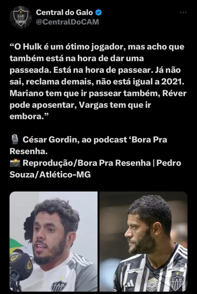 Apesar de todos os números incríveis, viralizou nas redes sociais, uma entrevista onde um torcedor e vereador do Clube, César Gordin afirma que o jogador deveria dar um ‘passeio’: “O Hulk é um ótimo jogador, mas acho que também está na hora de dar uma passeada. Está na hora de passear. Já não sai, reclama demais, não está igual a 2021. Mariano tem que ir passear também, Réver pode aposentar, Vargas tem que ir embora”, disse ao podcast ‘Bora Pra Resenha.
