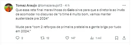 Diante disso, para 2024, por mais que o Galo não seja o grande campeão em 2023, o que está acontecendo agora precisa ser mantido, mas o time também precisa de voos maiores. Agora é com os ‘grandões’ da alta cúpula da Sede de Lourdes, mas o Alvinegro das Alterosas é forte, vingador e tem que ser mantido na briga entre os primeiros.