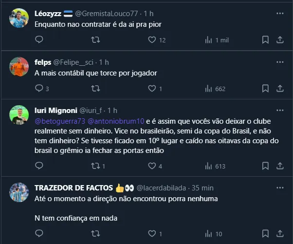 O mandatário do Tricolor vem sendo um dos mais cobrados pela torcida. Vale destacar também que, enquanto o Grêmio não se reforça, o Internacional contrata jogadores renomados.