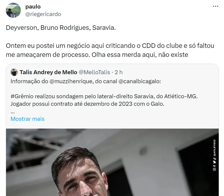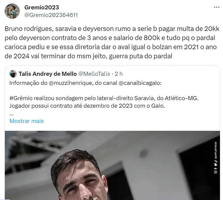 Já o jornalista Henrique Muzzi noticiou que o Grêmio fez sondagem pelo lateral Saravia, do Galo, fato que também não agradou os gremistas. O contrato do jogador com o time mineiro vai até dezembro.
