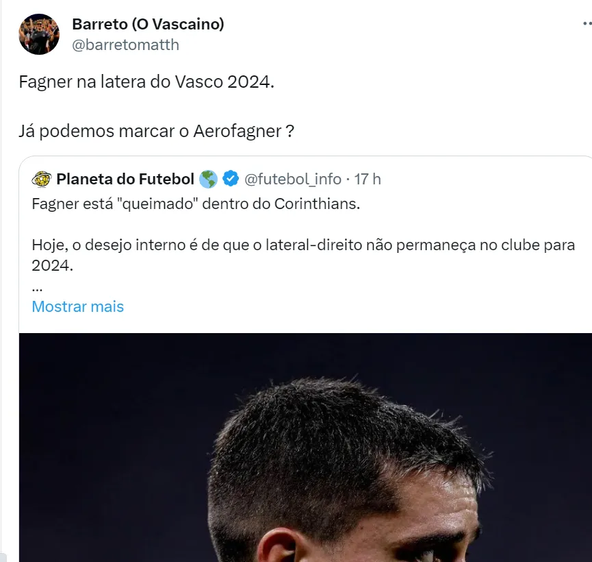 O jornalista Samir Carvalho informou que Fagner está “queimado” no Corinthians e existe o desejo internamente que ele não permaneça no Clube Paulista para a próxima temporada. O contrato do jogador de 34 anos com o Timão vai até dezembro de 2024. Com os corintianos na bronca com o lateral-direito, os vascaínos nas redes sociais estão pedindo para o atleta voltar para o Cruz-Maltino.