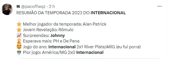 Com o resultado, o Internacional foi para a nona colocação da tabela de classificação, com 52 pontos conquistados, além de uma vaga na fase de grupos Copa Sul-Americana.