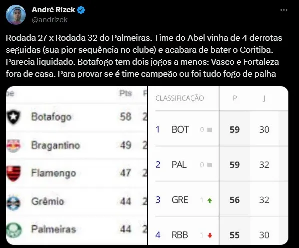 Enquanto isso, o Palmeiras, concorrente do Botafogo, saiu vitorioso na rodada atual e, mais uma vez, o treinador Abel Ferreira demonstrou franqueza ao falar sobre o time de Lúcio Flávio.