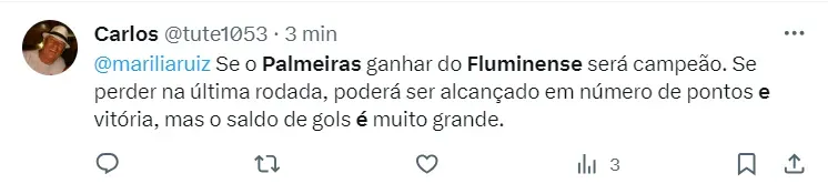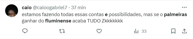 Atualmente, o Palmeiras é o líder do Campeonato com 66 pontos. Por isso, caso vença o Fluminense, e o Botafogo, Atlético-MG e Flamengo percam seus jogos, o alviverde será matematicamente o campeão brasileiro de 2023.