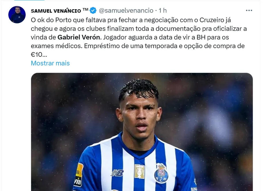 É Gabriel Veron, revelado no Palmeiras e hoje no Porto. Os portugueses já enviaram os documentos e o atacante é atleta do Cruzeiro para o Campeonato Mineiro, a Copa do Brasil, o Campeonato Brasileiro e a Copa Sul-Americana.