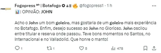 John é um bom goleiro e tem potencial para assumir a meta do clube carioca. Com a saída de Lucas Perri, John não terá dificuldades para ser o titular. Embora, o Fogão conte com Gatito Fernandez.