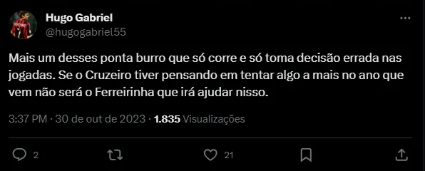 De acordo com o jornalista Gabriel Lauxen, da Copero TV, especializado em notícias do Grêmio, a diretoria do Cruzeiro está interessada na contratação do atacante Ferreira, que não vem tendo espaço no Imortal.