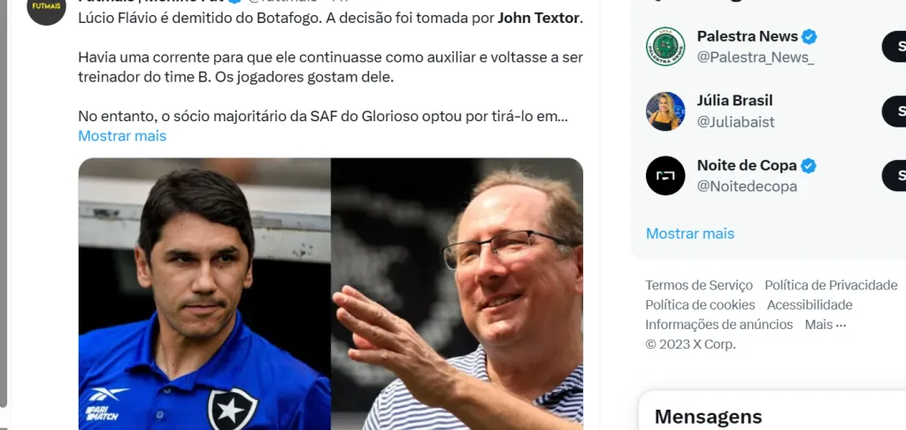 O Botafogo informa que, por decisão de John Textor e do Departamento de Futebol, Lúcio Flávio deixa o cargo de auxiliar técnico permanente. O Clube destaca o profissionalismo, comprometimento e… pic.twitter.com/ZdkznWu3HV