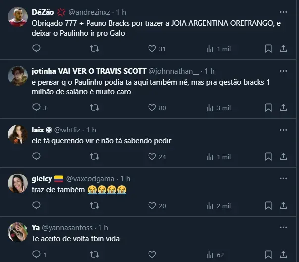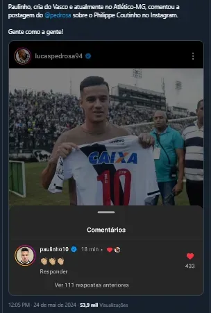 Dito isso, vale deixar claro que ambos são revelados na Colina e já expressaram o amor pelo Clube. Entretanto, como Paulinho é jogador do Atlético-MG, o comentário pegou a torcida de surpresa e os vascaínos também pediram seu retorno.