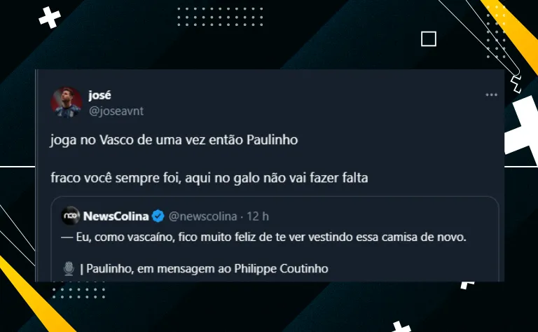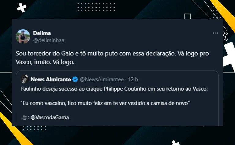 Dito isso, de olho na evolução do time, o meia Philippe Coutinho foi apresentado no último sábado (13) e causou barulho. Inclusive, o atacante Paulinho, cria da Colina, foi um dos ex-jogadores do Vasco a mandarem um recado ao atleta.