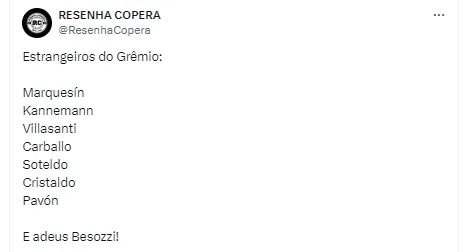 Com o acordo encaminhado com mais um gringo no elenco, o Grêmio passa a ter oito estrangeiros no elenco. Marchesin, Kannemann, Villasanti, Carballo, Cristaldo e Soteldo, além dos dois atacantes argentinos citados. O regulamento da CBF permite que apenas sete sejam relacionados para uma partida.