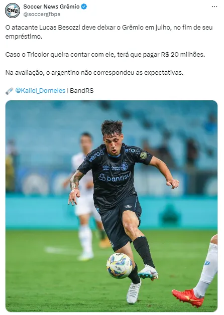 Com a chegada Pavón que já está bem encaminhada, o também atacante argentino Lucas Besozzi, não deve ficar na equipe comandada por Renato Gaúcho e deve ser devolvido ao Lanús, da Argentina, no meio do ano.
