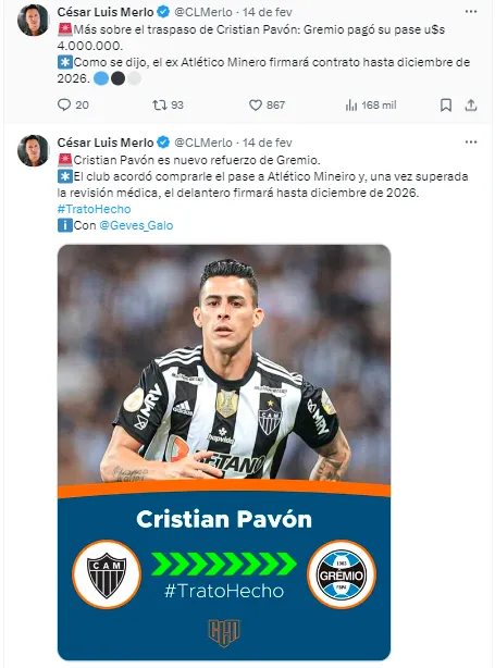 “Cristian Pavón é o novo reforço do Grêmio. O clube concordou em comprar a transferência do Atlético Mineiro e, concluído o exame médico, o atacante assinará até dezembro de 2026. Mais sobre a transferência de Cristian Pavón: O Grêmio pagou US$ 4 milhões pela transferência”, revelou Cesar Luís Merlo.