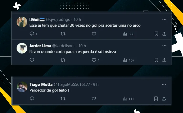 Inclusive, mesmo tendo marcado há duas rodadas diante do Palmeiras, o jogador não vive grande fase. Ao publicar a arte da partida contra o Cruzeiro, ele não gerou tanto polêmica quanto Edenilson, mas foi criticado.