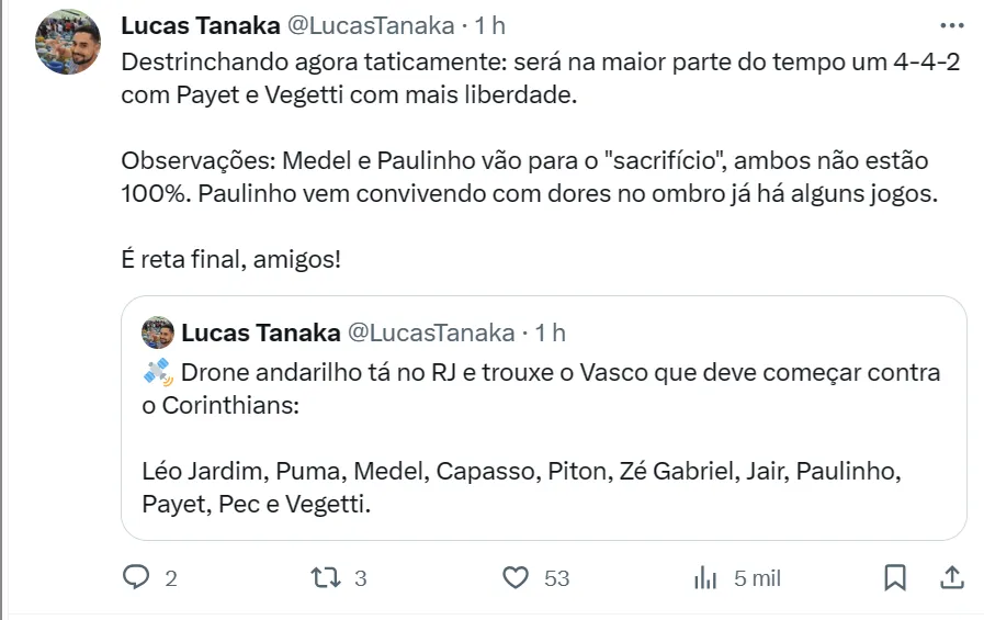 A escalação do Vasco contra o Corinthians, no 4-4-2, é a seguinte: Léo Jardim; Paulo Henrique, Medel, Capasso e Lucas Piton; Zé Gabriel, Jair, Paulinho e Gabriel Pec; Payet e Vegetti.