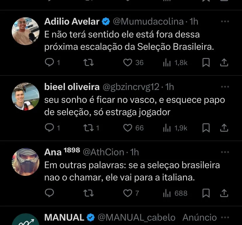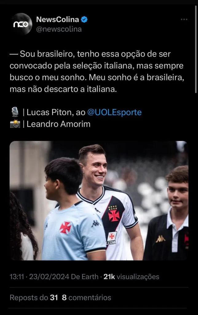 Com isso, em trecho trazido pelo UOL, o jogador vascaíno destacou sua vontade de vestir a camisa do Brasil: “Sou brasileiro, tenho essa opção de ser convocado pela seleção italiana, mas sempre busco o meu sonho. Meu sonho é a brasileira, mas não descarto a italiana”, disse.