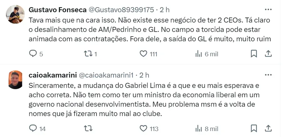 “Além da vontade de Gabriel Lima de sair, há também uma disposição dos atuais dirigentes de mudar o CEO do clube. A avaliação que o custo dele de R$ 150 mil por mês é muito alto”, explicou o jornalista em seu canal no Youtube.