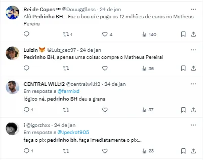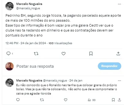 “Então, a partir de agora a divisão dos percentuais da SAF do Cruzeiro tem: 70% da SAF para o Ronaldo, 20% para o Pedrinho BH e mais 10% para o Cruzeiro (Associação). Em troca desses 20%, Pedrinho aportou R$ 100 milhões”, completou o jornalista.