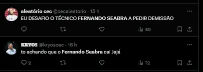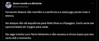 Segundo informações trazidas pelo setorista celeste Samuel Venâncio, o treinador Fernando Seabra deve seguir no comando da Raposa. O nome agrada ao empresário.