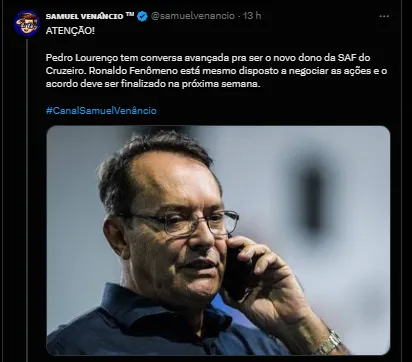 A informação foi trazida em primeira mão pelo setorista Luiz Henrique, do site No Ataque. Samuel Venâncio, confirmou a informação em suas redes sociais. “Pedro Lourenço tem conversa avançada para ser o novo dono da SAF do Cruzeiro. Ronaldo Fenômeno está mesmo disposto a negociar as ações e o acordo deve ser finalizado na próxima semana”, publicou Samuel.