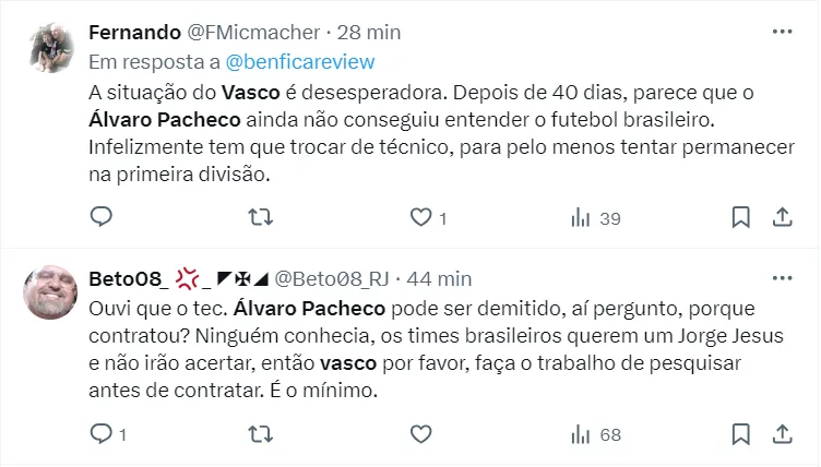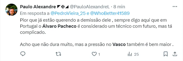 “Decisão tomada na madrugada. Após derrota para o Juventude, por 2 a 0, Álvaro Pacheco não será mais o técnico do Vasco da Gama. O diretor executivo Pedro Martins, que a pedido da 777 contratou o treinador, agora a pedido do Pedrinho, será o responsável ao comunicá-lo da demissão”, revelou.