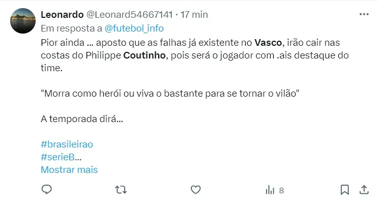 O mandatário explicou que se não houver “uma saída pronta (um comprador), muito dinheiro novo entrando ou um mega plano na manga, o certo é não contratar o Coutinho e ainda precisaria rápido diminuir custos”.