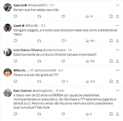 Neste contexto de incômodo com os parceiros, o atual presidente Cruz-Maltino, Pedrinho, não se calou ao abordar a relação entre o Gigante e os norte-americanos. O dirigente declarou não concordar com muitos passos pela 777 Partners, ao conceder entrevista coletiva em São Januário.