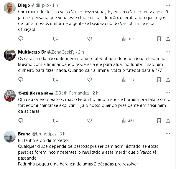 É importante destacar que Pedrinho, presidente do clube associativo do Vasco, assumiu o controle do futebol após uma liminar que retirou a gestão da 777 Partners, empresa que havia assumido o comando do Gigante da Colina.