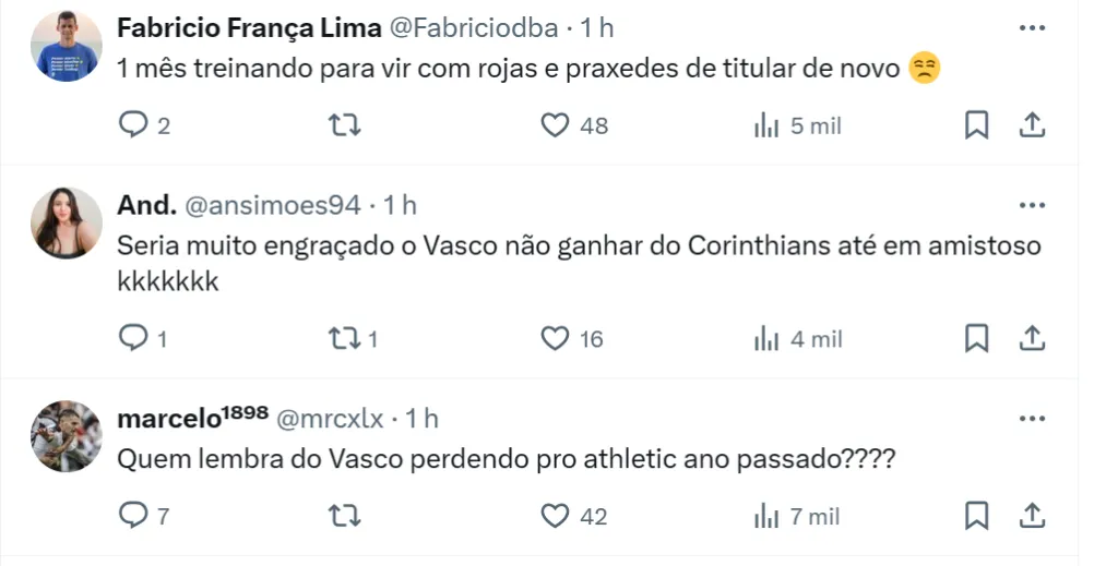 Inclusive, o Corinthians acertou um amistoso contra o Santos, na Vila Belmiro, na próxima sexta-feira (22), às 15h (horário de Brasília), com portões fechados. O pensamento do Vasco é parecido com a intenção de preparar o elenco para o Brasileirão.