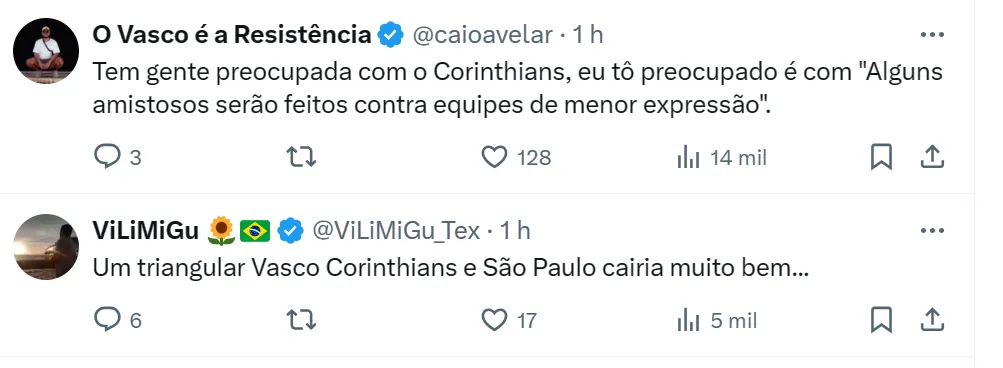 “Há uma conversa do Corinthians com o Vasco para que um amistoso entre as duas equipes aconteça. Não está definido, mas a chance, adequando as datas, existe”, reforça Pedrosa. O clube paulista também está com tempo livre até o fim do mês.
