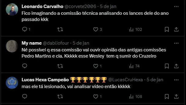 Contratado em janeiro de 2023, Wesley chegou ao Cruzeiro com o objetivo de recuperar o futebol apresentado no Palmeiras. Em Minas Gerais, o atacante não alcançou o esperado pela diretoria e torcida.