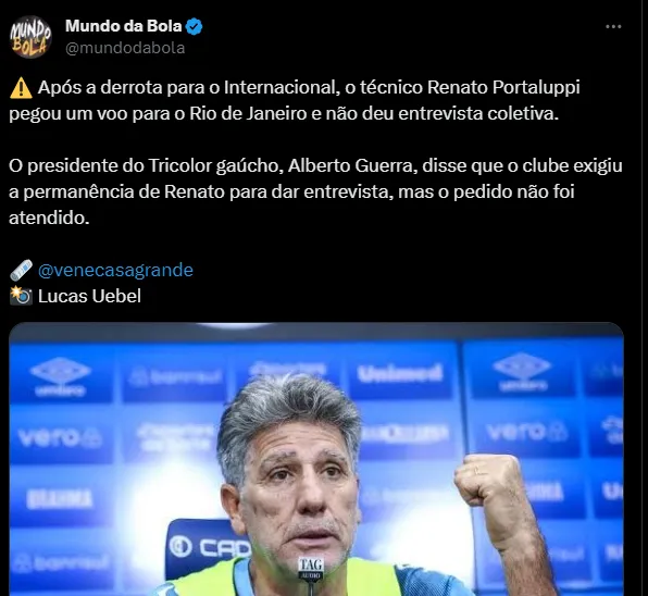 No entanto, o que chamou mais atenção após a derrota no Grêmio foi a atitude do técnico Renato Portaluppi. O profissional não concedeu entrevista coletiva, já que tinha viagem marcada para o Rio de Janeiro depois da partida, até por conta da pausa para a Data-Fifa. A atitude do treinador irritou o presidente do Imortal, Alberto Guerra, que detonou Renato e colocou em dúvida seu futuro no Clube.