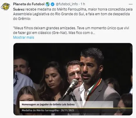 Porém, fora das preocupações referente aos gramados, o Inter foi surpreendido por ir parar no discurso de um atleta que integra as fileiras do arquirrival. Nesta terça-feira (28), o centroavante Luis Suárez recebeu a medalha do Mérito Farroupilha na Assembleia Legislativa do Rio Grande do Sul e não esqueceu o Inter.